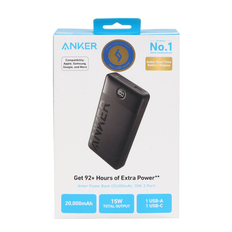 بسته شامل: پاور بانک Anker (20000 میلی آمپر ساعت، 15 وات، 2 پورت)، کابل USB-C و USB-A، دفترچه راهنمای دستورالعمل و پشتیبانی مشتری