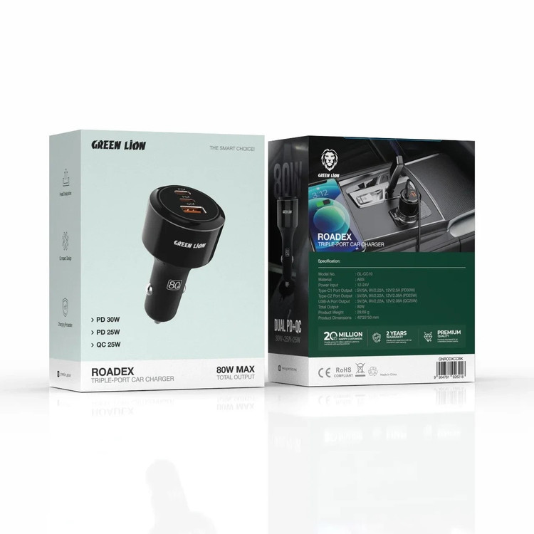 GREEN LION | شارژر فندکی سه پورت 1 متر کابل دو سر تایپ سی + Roadex Triple Port Car Charger 80W گرین لاین